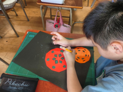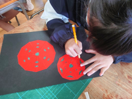 図画工作科の時間は、カッターナイフを使って画用紙を切り抜き、花火の模様を作っています。