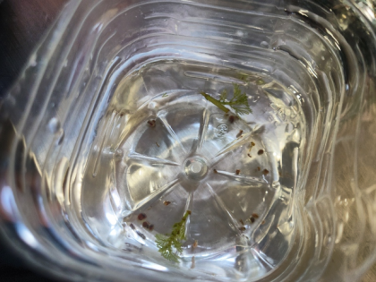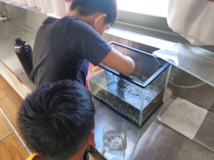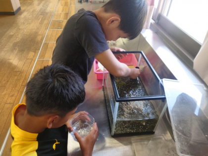 休み時間、理科室で子どもたちが水そうのたにしをすくっていました。