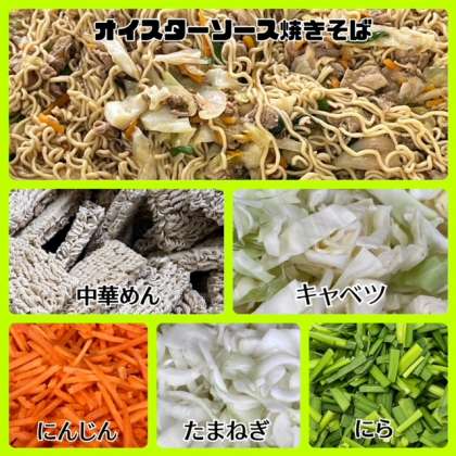 オイスターソース焼きそばは、豚肉を主材にテンメンジャン・オイスターソースなどで味つけしています。麺はかためにゆで、野菜を炒めた具の中に入れてさらに炒めます。今日は約12kgの中華めんを使用しています。