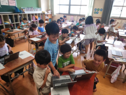 1学期に、6年生に1人1台パソコンの使い方を教えてもらった1年生。