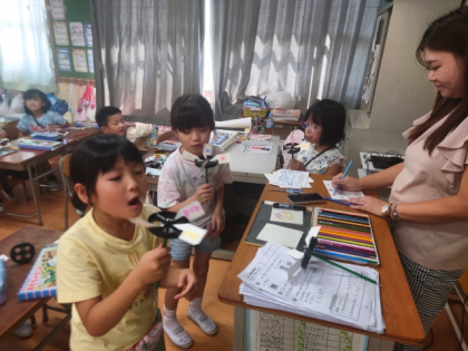 生活科の時間は、風の力で回るおもちゃを作りました。