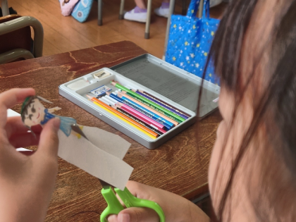 図工科の時間は、色えんぴつで泳いでいる人の形を描いて、はさみで切り、スティックのりではっていきます。
