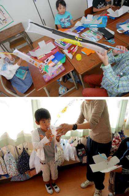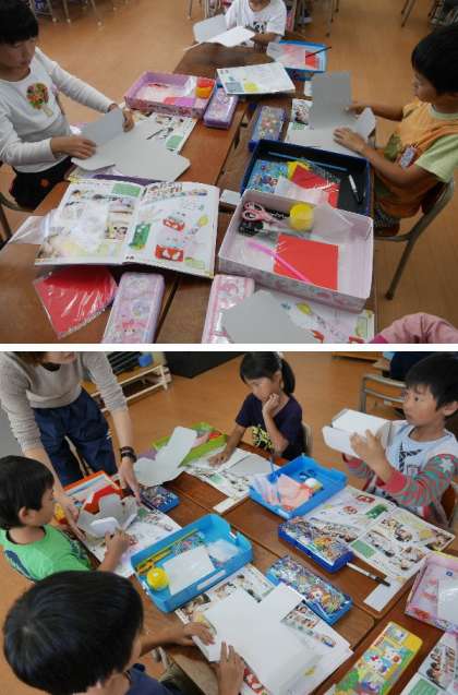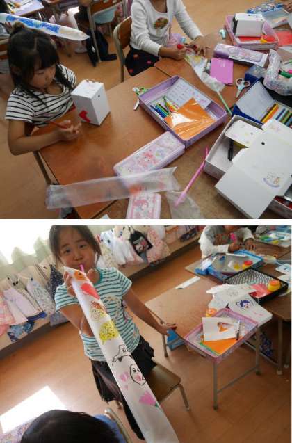 1年生がにょきにょきと飛び出すおもちゃを作っています。箱を組み立てて、絵を描いたビニール袋にストローをつけて息を吹き込むとニョキニョキと飛び出してきます。たのしそうですね。