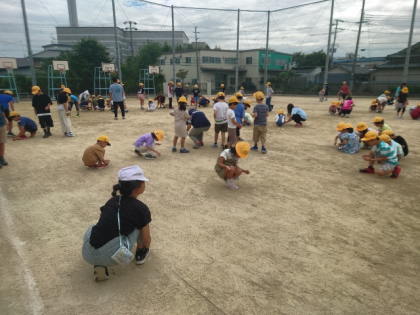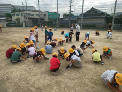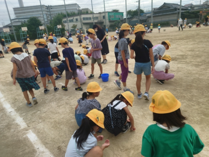 今日の集会の時間は、運動会に向けて全校児童が運動場の石拾いをしました。