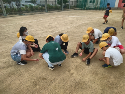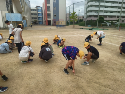 今日の集会の時間は、運動会に向けて全校児童が運動場の石拾いをしました。
