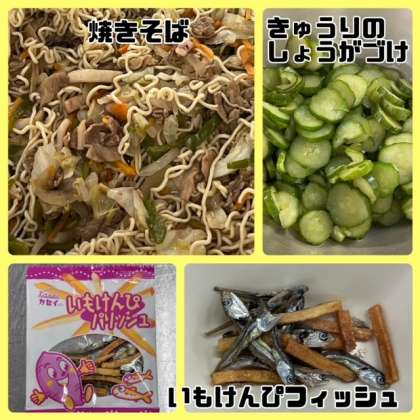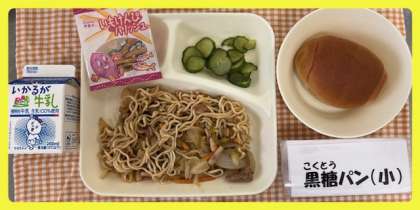 今日の献立は、焼きそば・きゅうりのしょうがづけ・いもけんぴフィッシュ・黒糖パン(1/2)・牛乳でした。