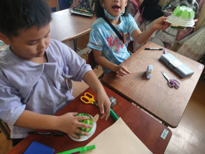 生活科の時間は、ゴムの力で転がるおもちゃを作りました。
