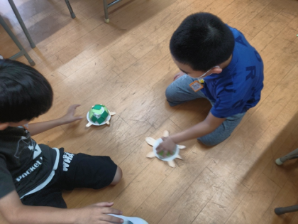 教室で、試しに何回も転がして、うまく転がるように改良したり工夫したりしました。