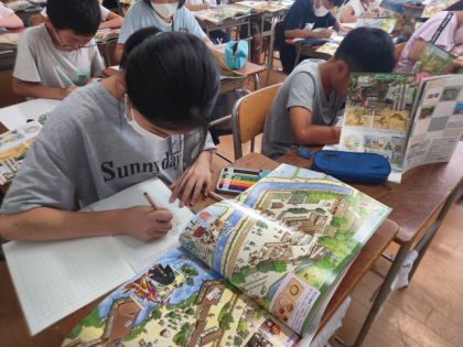 社会科の時間は、武士の屋敷の図を見ながら、「屋敷の中」「屋敷の周り」「周りでくらす人びと」「食事」「服装」の5つの視点で、武士がどんなくらしをしていたのか調べました。