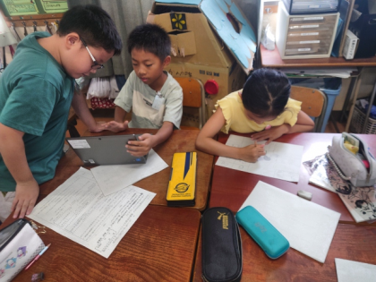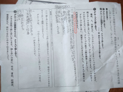 今日は、これまでの話し合いをもとに、他の小学校の子どもたちに、焼野小学校のよさについて紹介するための原稿をグループのみんなで考えてつくりました。
