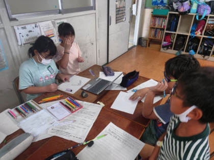 今日は、これまでの話し合いをもとに、他の小学校の子どもたちに、焼野小学校のよさについて紹介するための原稿をグループのみんなで考えてつくりました。