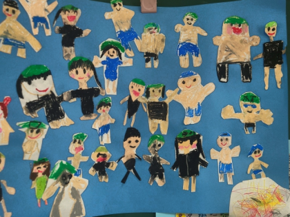 図工科の時間は、色えんぴつで泳いでいる人の形を描いて、はさみで切り、スティックのりではっていきました。