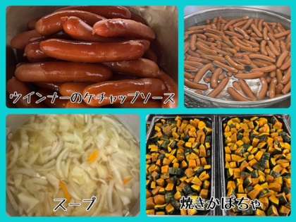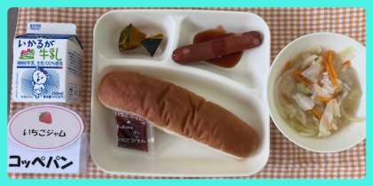 今日の献立は、ウインナーのケチャップソース・スープ・焼きかぼちゃ・コッペパン・いちごジャム・牛乳でした。