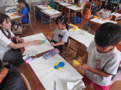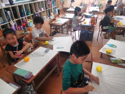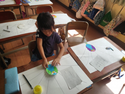 パスでくじゃくの絵を描いて切り取り、画用紙にのりで貼り付けています。