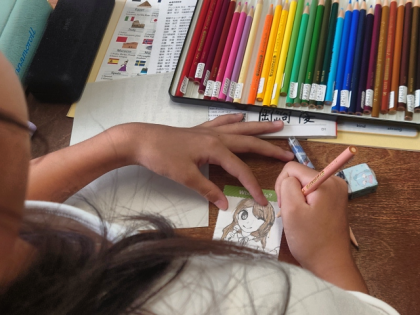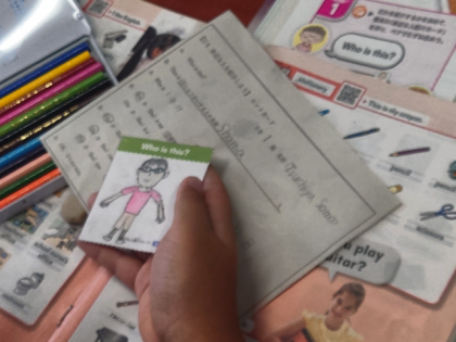 英語科の時間は、身近な人を英語の表現で紹介するために、カードに英語の文を考えて書いたり、似顔絵を描いたりする作業をしました。