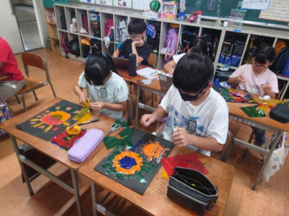 図画工作科の時間は、カッターナイフを使って画用紙を切り抜き、花火の模様を作っています。