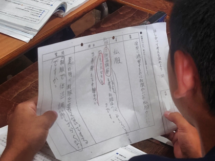 国語科の時間は、「学校に通学するのに制服がいいか私服がいいか」という話題について、それぞれの立場の考えを聞き合ったり、質問し合ったりしながらグループで話し合いました。