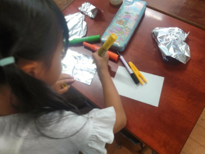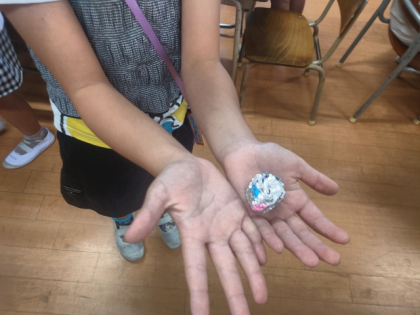 生活科の時間は、紙コップを使って、どんなおもちゃが作れるのか考え、実際につくって遊んでみました。