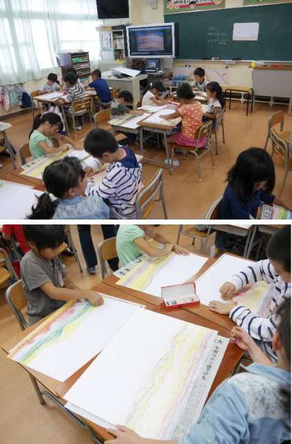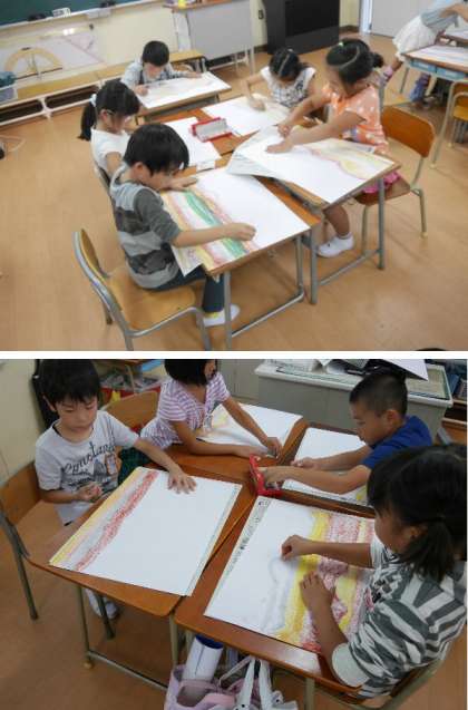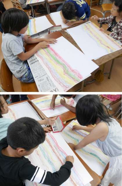 2年生が地面の断層の写真を見て、クレヨンを横にスライドさせて断面の絵を描いていました。なかなか上手に描けていますね。