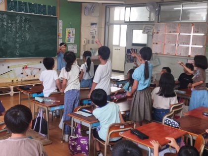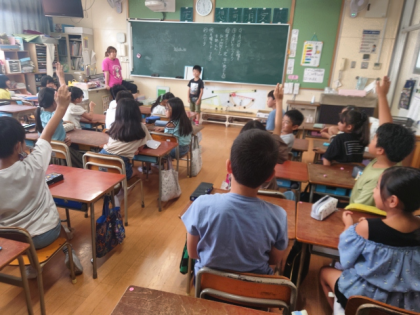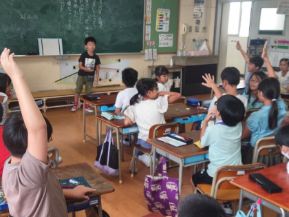 学級活動の時間をつかって、質問をしながら、ホワイトボードに書かれたヒミツの言葉を当てるゲームをしました。