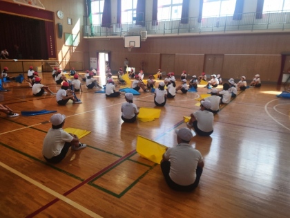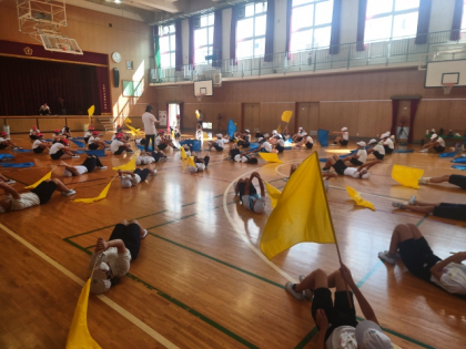運動会に向けて、団体演技のフラッグの練習をしています。