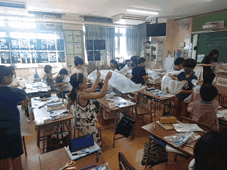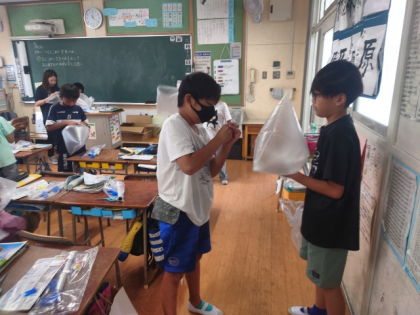 理科の時間は、ビニル袋の中に空気を入れて、とじこめた空気や水をおして、おし返す力や体積の変化を調べる実験をしています。