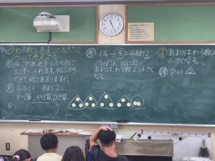 算数科の時間は、「14このあめを1ふくろに3こずつ入れます。何ふくろできて何こあまりますか」の問題について考えています。