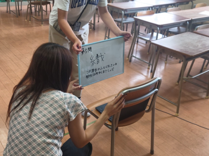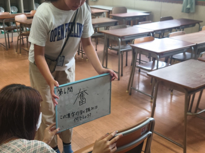 集会委員が、漢字の画数や読み方などの問題を出し、班で考えて答えます。