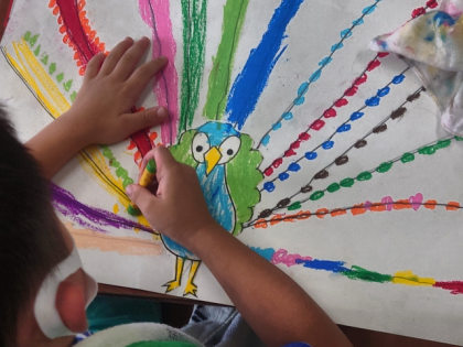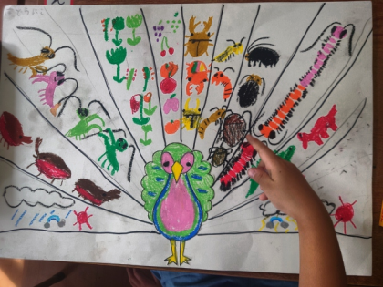 図工科の時間は、くじゃくの絵を描きました。