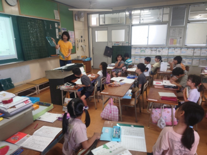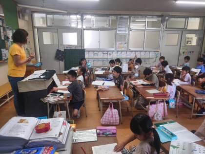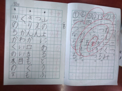 国語科の時間は、「やまの うえに ある どうぶつえん」「かわの ちかくの きの した」などの文を、習った漢字を使って書きました。