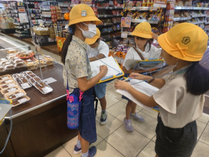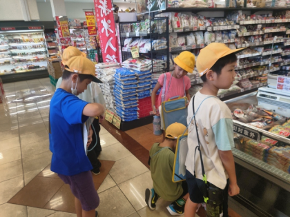 子どもたちは「安売りしているものが目立つようにしている」「きれいに商品が並べられている」「たくさんの商品が置いてあり、品ぞろえがよい」「食品と一緒に文房具なども買えるので便利」「中でお惣菜を作っているのが見えるので安心」など、たくさんのヒミツを見つけることができました。