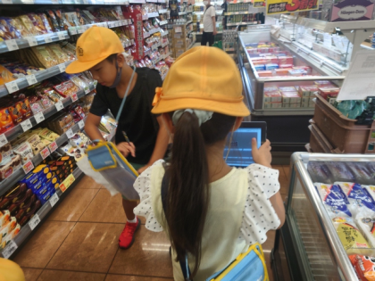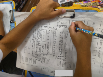 子どもたちは、タブレットやたんけんボードを持って売り場を一生懸命調べて「お店の売り方のヒミツ」をたくさん見つけることができました。