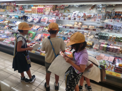 子どもたちは「安売りしているものが目立つようにしている」「きれいに商品が並べられている」「たくさんの商品が置いてあり、品ぞろえがよい」「食品と一緒に文房具なども買えるので便利」「中でお惣菜を作っているのが見えるので安心」など、たくさんのヒミツを見つけることができました。
