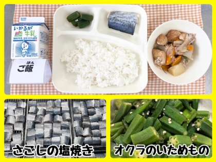今日の献立は、さごしの塩焼き・含め煮・オクラのいためもの・ごはん・牛乳でした。