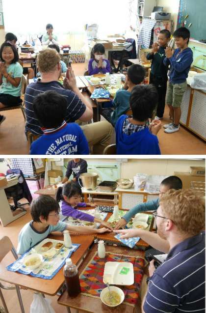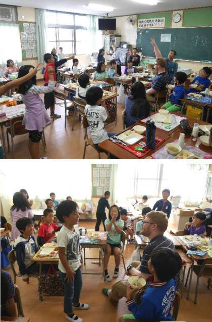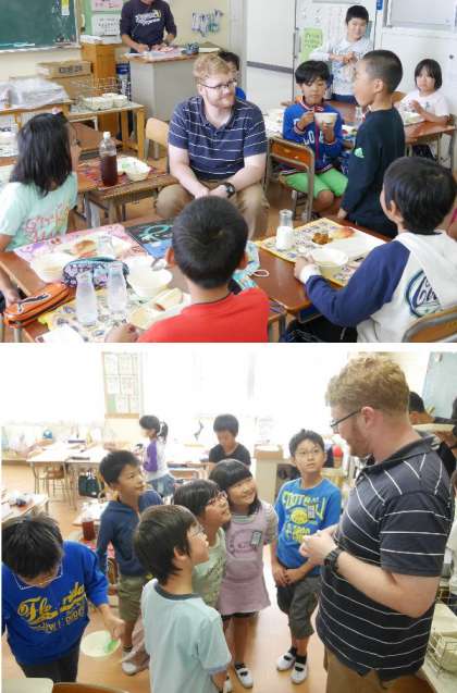 4年生の給食に、中学校から英語のメイソン先生がきてくれました。いつも簡単な英語で話しかけてもらったり遊んでくれます。牛乳じゃんけんもしました。