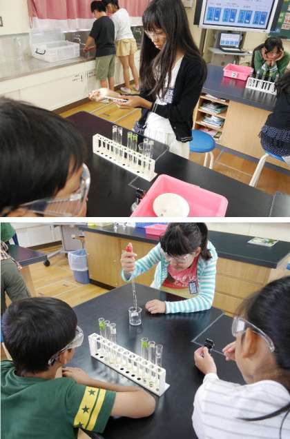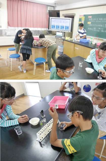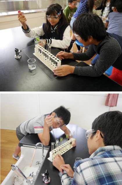 6年理科の実験のようすです。ゴーグルをして科学者になって水溶液をスポイトでとって実験しています。塩酸に金属を入れると変化があるのですが、それ以外の水溶液、水酸化ナトリウムや食塩水で金属は変化するかな。真剣に試験管の変化を観察していました。