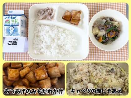 今日の献立は、肉じゃが・あつあげのみそだれかけ・キャベツの赤じそあえ・ごはん・牛乳でした。