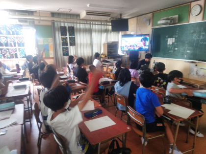 今日は、都島区の桜宮小学校とオンラインで結び、自分たちの学校のよさを紹介し合いました。