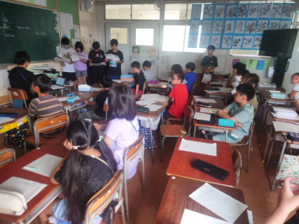 焼野小学校からは「学校が新しいこと」「オリエンテーリングのこと」「好きな場所(理科室・運動場)」「鶴見緑地」「作品展」「学習園や木・花」「夏まつり・もちつきなど地域の行事」などのことについて伝えました。