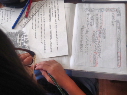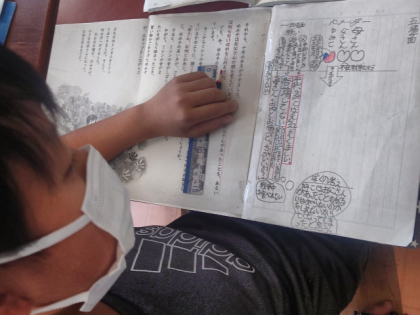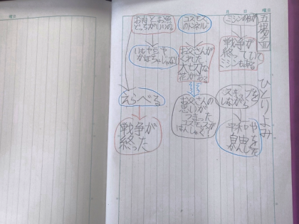 五場面の登場人物の行動や気持ちをノートに整理しています。