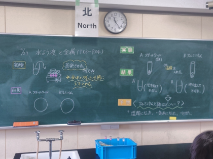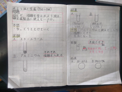 今日は、「なぜ塩酸を含む水よう液は、金属製品に使えないのか」という課題について、実験で確かめています。