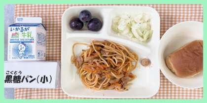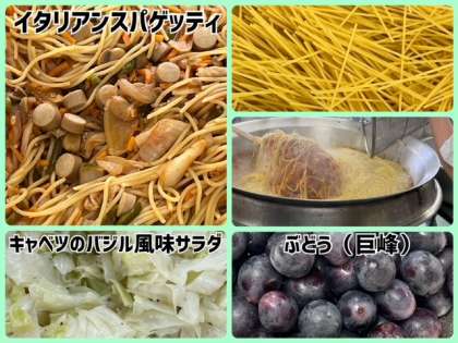 今日の献立は、イタリアンスパゲッティ・キャベツのバジル風味サラダ・ぶどう(巨峰)・黒糖パン(1/2)・牛乳でした。