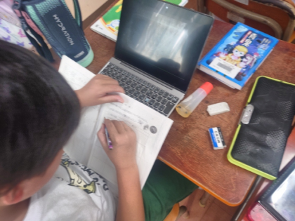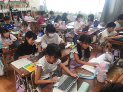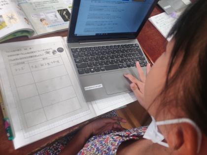 理科の時間は、自分が関心のある昆虫の育ちについて、PCなどを使って調べ、ワークシートにまとめています。