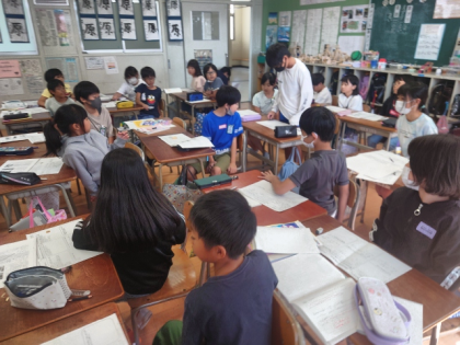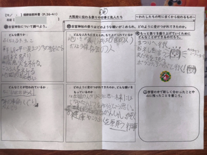古宮神社のお祭りが、「どんな祭りか」「どんなことが行われているか」「どんな人たちに支えられ、もり上げられているか」「どのように受けつがれてきたのか、また、どんな願いをもっているのか」なのについて、調べたことをワークシートにまとめたことを発表しました。
