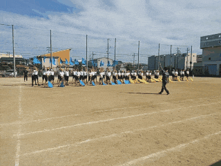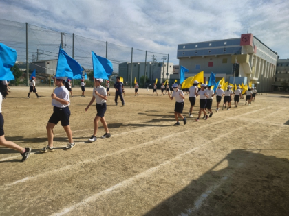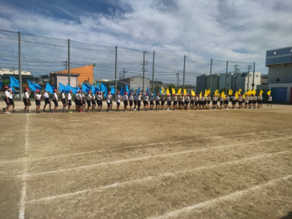 運動会に向けて、団体演技のフラッグの練習をしています。