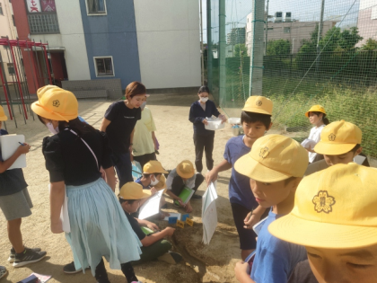 理科の時間は、流れる水にはどんな働きがあるのか、実際に土山に水を流し、水の流れの速さ、土の様子、地面のようすを調べました。