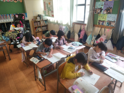 国語科の時間は、絵から場面の様子や人物がすることを想像して、お話を書きました。