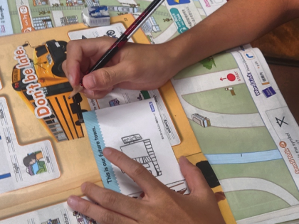 教科書の町の地図に、どんな建物をつけ足そうかと、一人一人考えています。