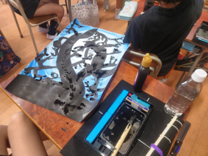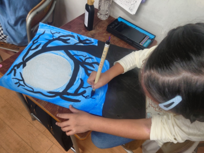 図工科では、国語科の教科書の教材文「モチモチの木」の場面を絵で表しました。