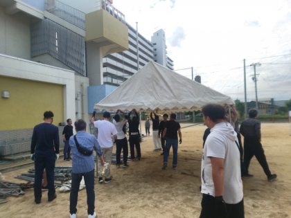 運動会前日の本日午後、焼野地域活動協議会の中田会長はじめ、20人ほどの地域の皆さまが子どもたちのために児童席のテントを6張りたててくださいました。